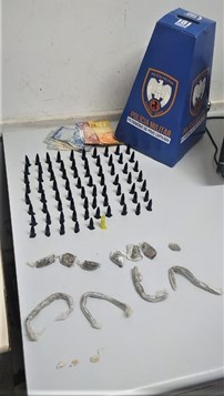 Em outra ação, dessa vez no bairro São Diogo, militares visualizaram e abordaram um suspeito, com ele foram encontrados 76 pinos de cocaína, 11 buchas de maconha, 3 pedras crack e R$ 61,00 reais em espécie.
