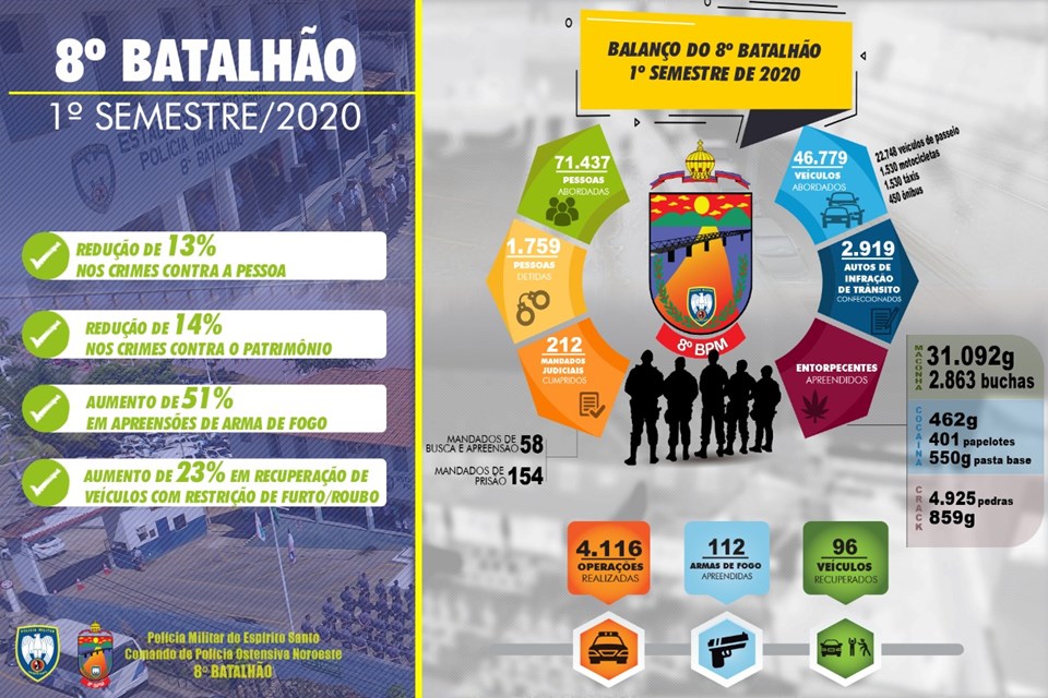 O 8º Batalhão da Polícia Militar, comandado pelo tenente-coronel Gabriel Amâncio de Souza Porto, divulgou os resultados do balanço do primeiro semestre de 2020.