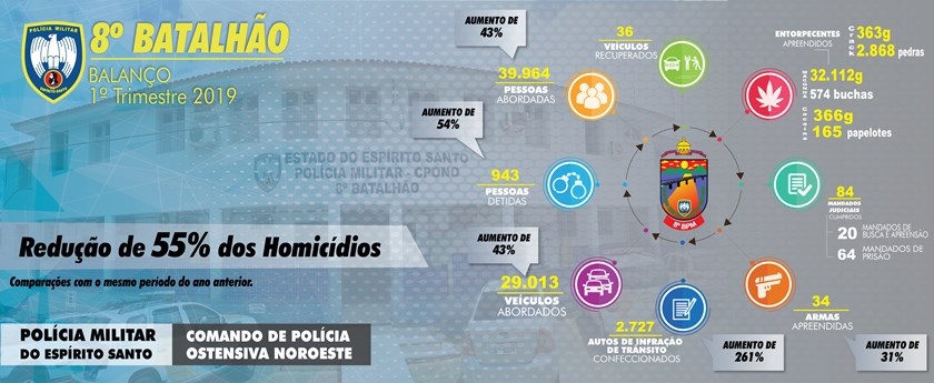 Durante o 1ª trimestre de 2019, o 8° Batalhão realizou diversas ações policiais de prevenção e repressão qualificada, que culminaram em resultados positivos para a população dos sete municípios que compõem a Unidade Operacional.