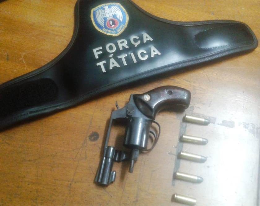 Por volta das 17 horas, a equipe da Força Tática durante patrulhamento pelo bairro Direção, em Praia Grande, avistou um grupo suspeito, que fugiu do local ao perceber a presença da viatura. Um dos suspeitos estava com uma arma de fogo em punho. D.D.R., de 20 anos foi alcançado e abordado. Após realizarem buscas no local, os policiais encontraram a arma, um revólver calibre 38 com cinco munições de mesmo calibre.
