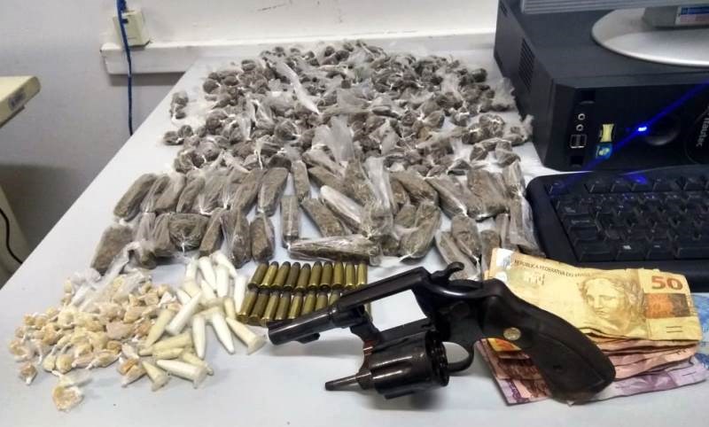Em novas diligências, a equipe prosseguiu até a residência da abordada e chegando lá visualizou na varanda, que fica no segundo andar, um homem em posse de arma de fogo. Ao avistar as viaturas o suspeito tentou fugir, mas foi alcançado. A arma, um revólver calibre 38, municiado com seis munições de mesmo calibre, foi apreendida. Em buscas na residência foram encontrados 20 pinos de cocaína, 356 buchas de maconha, 53 pedras de crack e 14 munições de calibre 38. Mais duas pessoas suspeitas estavam no imóvel. Os militares também encontraram cinco crianças, que foram entregues ao conselho tutelar.