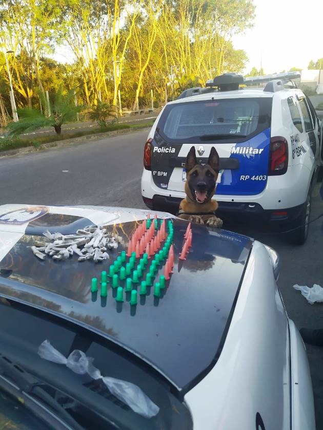 Em uma ação, a Equipe K9 foi acionada para atuar no bairro Cidade Continental, setor Oceania. No local, foi empregado o cão farejador Apollo, que localizou 85 pinos de cocaína e 54 buchas de maconha.