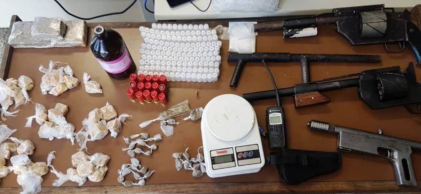 Após chegada do apoio e cessada a troca de tiros, os militares adentraram no terreno e na residência para onde os indivíduos correram, porém eles já haviam fugido do local. Ao realizar buscas no terreno e na residência, os militares localizaram duas escopetas calibre 12, estando ambas municiadas com seis munições; uma escopeta calibre 12 (bate-bate); uma submetralhadora calibre 380, alimentada com uma munição de mesmo calibre e picotada; três munições calibre 12; dois tabletes de substância similar à maconha; um coldre de arma de fogo e um rádio comunicador; 36 pedras grandes de crack; 34 buchas de maconha; 146 frascos de lolo; um frasco de clorofórmio; duas balanças de precisão e materiais para embalo de entorpecentes.