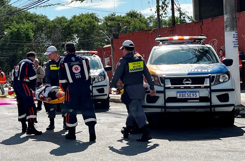 Foram mais de 50 participantes na simulação, entre integrantes do SAMU, Notaer, Guarda Municipal, Corpo de Bombeiros, Polícia Civil e Polícia Militar, representada pelo Bptran. Os “acidentados” são acadêmicos de cursos ligados à área da saúde.