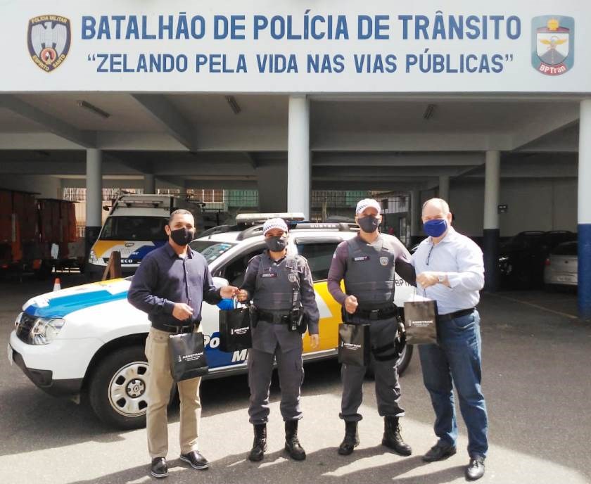 A Associação dos Servidores Policiais Militares do Batalhão de Trânsito (Assetran) fez a entrega de 200 máscaras ao Batalhão de Polícia de Trânsito (BPTran). O presidente e vice-presidente da Assentran, tenente da reserva Celso Monteiro Berlinck e subtenente da reserva Weber Trabach Braga, respectivamente, estiveram na sede do BPTran nesta segunda-feira (11) e fizeram a entrega do EPI.