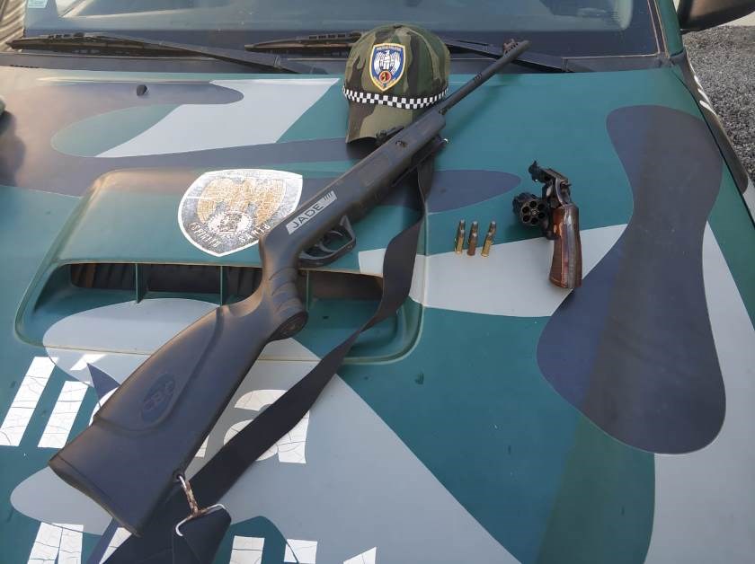 Durante as buscas, os policiais localizaram um revólver calibre 38, 32 munições calibre 38, oito munições calibre 32, um frasco contendo pólvora, seis espoletas, uma espingarda de pressão calibre 5.5, modificada para calibre 22, uma munição calibre 22 e uma armadilha de metal comumente utilizada para caça do tipo arataca. Uma pessoa foi conduzida ao plantão policial local.