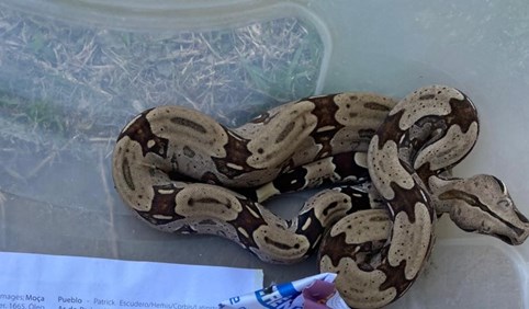 No local, a equipe verificou a presença de duas serpentes, sendo uma jiboia (*Boa constrictor*) e uma cascavel (*Crotalus durissus*) mantidas em cativeiro e sem a autorização do órgão competente.