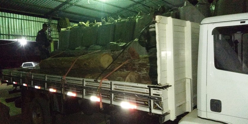O caminhão continha 10 toras de árvore nativa, um total de 4,88m³ guardadas sobre sua carroceria, estacionado no interior do galpão.
