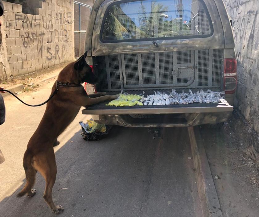 Os militares foram acionados pelo coordenador de operações e prosseguiram para apoiar uma ação do 6º Batalhão. Chegando ao bairro Guaraciaba, foi empregado numa zona extensa de mata o cão de faro, que identificou o esconderijo de 320 buchas de maconha, 254 pinos de cocaína e 68 pedras de crack.