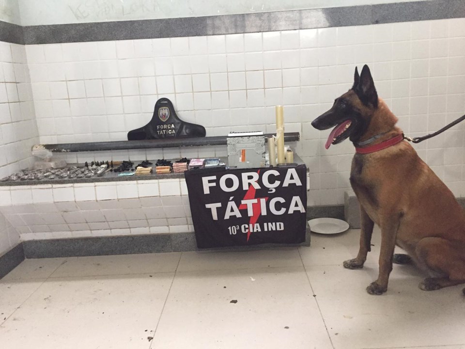 Policiais militares da Força Tática da 10ª Companhia Independente, juntamente com as equipes da Polícia Civil, do Serviço Reservado e da Força Tática da 9ª Companhia Independente, participaram das ações na região de Campo Acima, onde a cadela policial Kênia e seus condutores, soldado Márcio Lopes e soldado Romeiro, foram fundamentais para a localização de grande quantidade de material ilícito e a detenção de três indivíduos suspeitos de cometerem tráfico de entorpecentes.