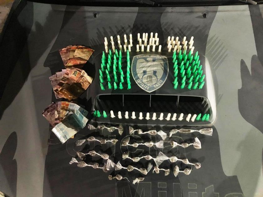 Ainda em patrulhamento tático motorizado, a equipe abordou dois indivíduos em fundada suspeita, pois demonstraram nervosismo diante da equipe, logrando êxito em apreender em posse deles 40 buchas de maconha, 134 pinos de cocaína e mais R$ 359,00 em espécie.