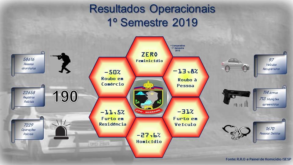 O Comando de Polícia Ostensiva Serrano, por meio de suas Unidades Operacionais que juntas realizam o policiamento ostensivo em 18 municípios da região Serrana do Estado do Espírito Santo, apresenta à comunidade os resultados de seu trabalho durante o 1º semestre de 2019.