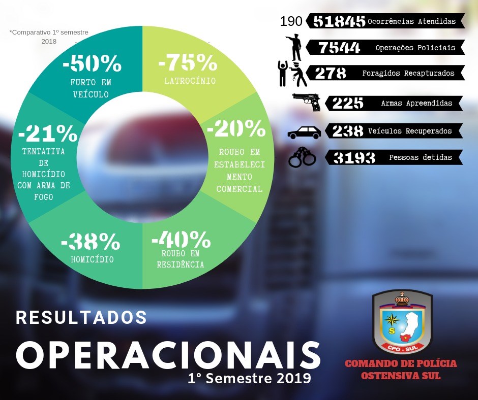 No período compreendido entre 01 de janeiro a 30 de junho do presente ano, foram realizadas, em média, 42 operações policiais todos os dias na região Sul do Estado, ou seja, ao todo 7.544 operações policiais, dentre cercos-táticos, blitz, e abordagens a pessoas e a veículos diversos.