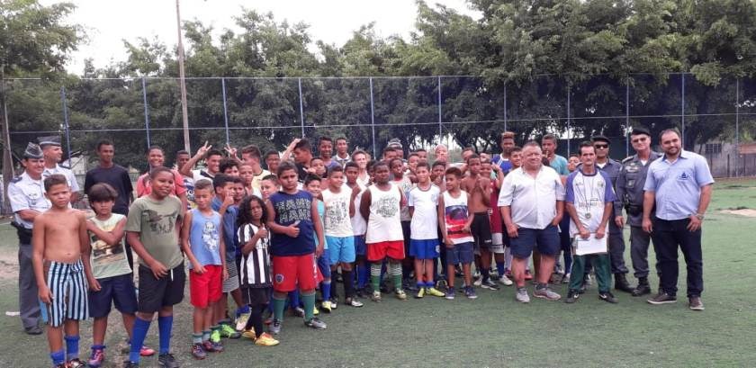 As crianças que participam das aulas de futebol do projeto social Lutando pela Vida receberam a visita do comandante do 13º Batalhão, tenente coronel Giuliano Menegatti, durante a tarde dessa quinta-feira (14). O projeto funciona no campo de futebol do bairro Vila Nova, em São Mateus.