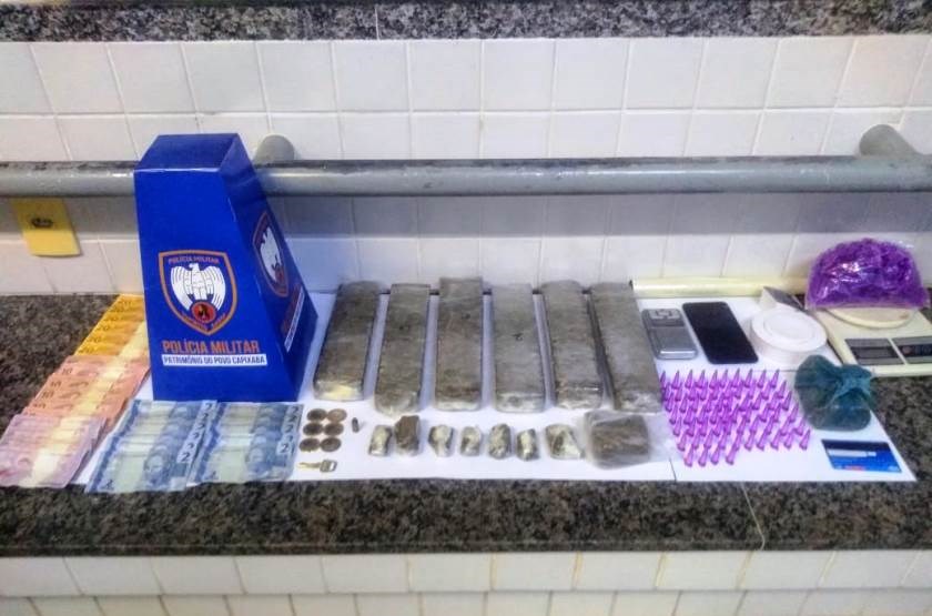 Após a abordagem policial foi localizado no interior do imóvel seis tabletes de maconha, um pedaço grande da mesma droga, uma barra grande de crack, 64 pinos de cocaína, uma munição calibre 32, R$228,00 em espécie, três balanças de precisão e material para embalo de entorpecentes.