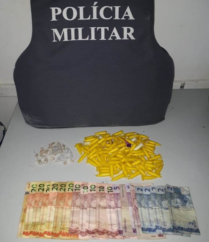O jovem foi abordado, sendo encontrada uma pequena quantidade de drogas. A outra parte foi localizada bem perto de onde o suspeito estava. No total foram encontrados 114 pinos de cocaína, 24 pedras de crack e a quantia de R$ 220,00. O jovem admitiu estar traficando no local.