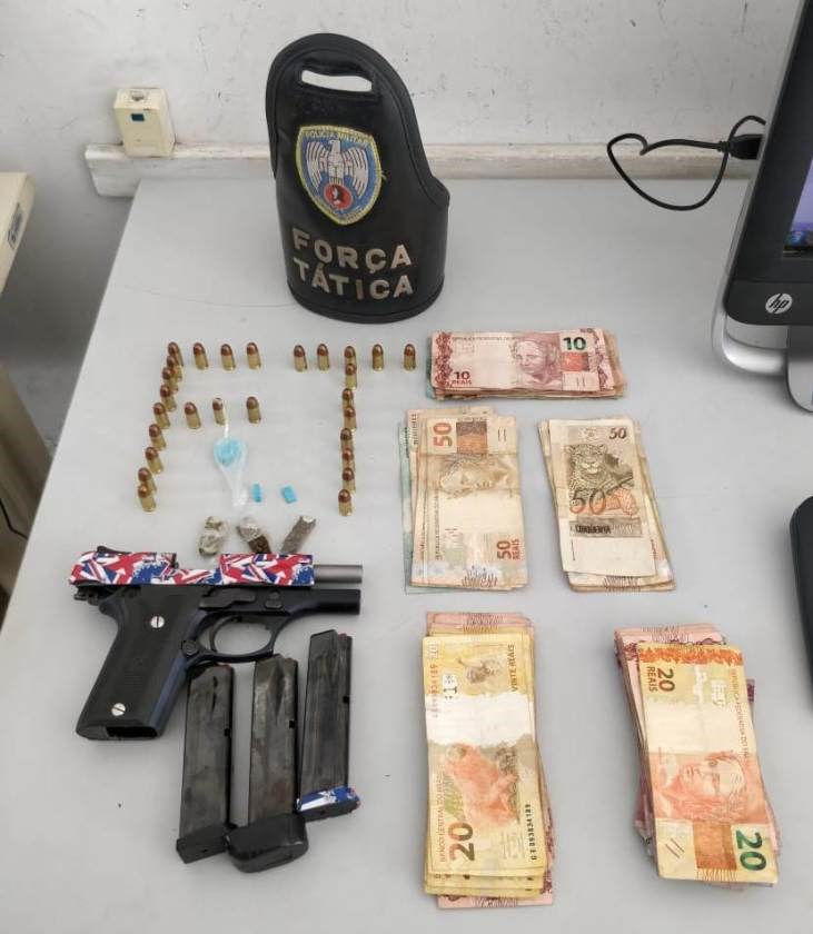 No bairro Maria Niobe, durante o patrulhamento, a Força Tática abordou um indivíduo que informou aos militares a existência de uma arma de fogo dentro de sua residência. No total foram recolhidos uma pistola 380 com três carregadores e 27 munições, além de três buchas de maconha, seis comprimidos de ecstasy e R$2.340,00 em espécie.