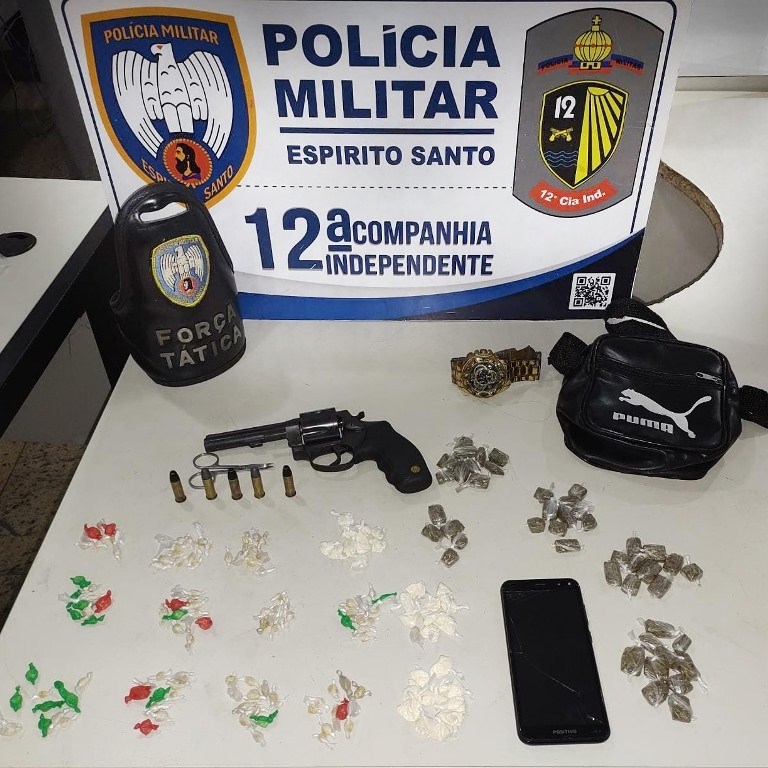 Militares da Força Tática da 12ª Companhia Independente observaram um suspeito na rua Ciro Vieira da Cunha, durante patrulhamento. Realizada a abordagem e busca pessoal, os policiais localizaram 45 buchas de maconha, 107 pedras de crack, 30 papelotes de cocaína, um revólver 38 e cinco munições.