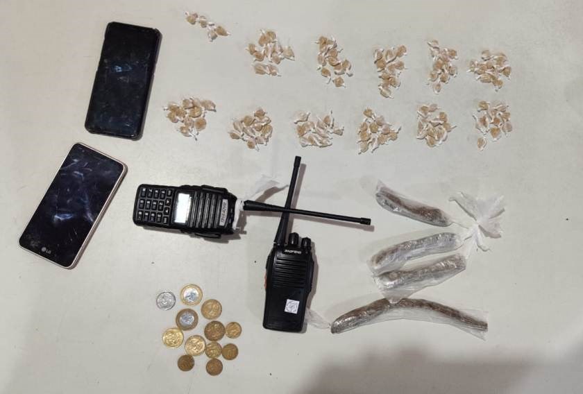 Ao realizar buscas no local, os militares encontraram 114 pedras de crack, quatro buchas grandes de maconha, dois rádios comunicadores, dois aparelhos celulares e R$ 4,00 em moedas.