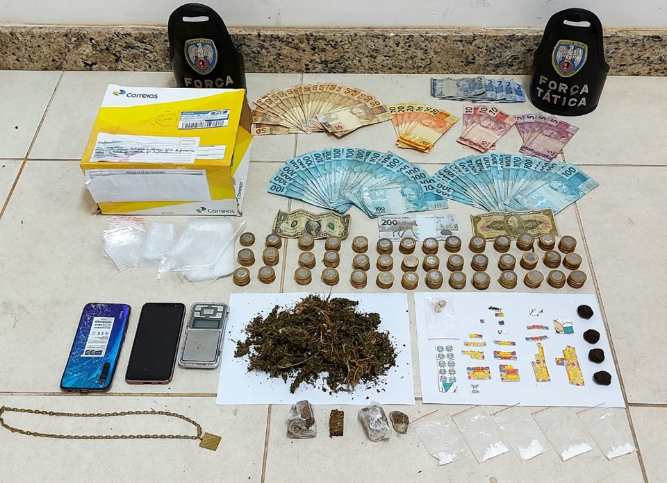 Ainda foram localizados R$424,86 em moedas, uma balança de precisão, quatro buchas de haxixe, 208 unidades de droga sintética "LSD" e material utilizado para embalar os entorpecentes.