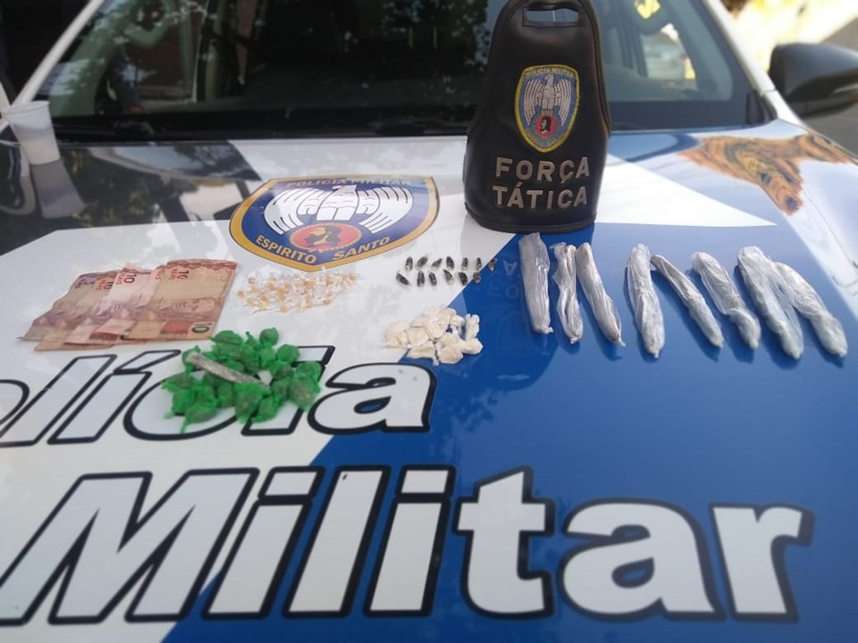 Na tarde de sexta-feira (12), por volta das 15h, durante patrulhamento em Maria Ortiz, a equipe de Força Tática avistou um suspeito no Campo do Wi-Fi. A abordagem foi realizada e durante a busca pessoal foram encontradas 24 buchas de maconha e R$45,00 em espécie. Ao ser indagado se havia mais entorpecentes escondidos, o abordado indicou que próximo a rampa de skate havia um copo descartável, sendo encontradas 49 pedras de crack e próximo a trave do parque havia mais drogas, sendo e oito buchas grandes de maconha, 13 bolas de haxixe e 14 papelotes de cocaína.