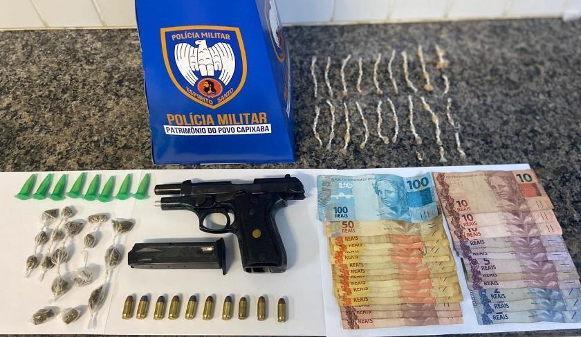 Durante a noite, um homem de 23 anos foi detido com uma arma de fogo calibre 380 municiada com 10 munições e R$468,00. Ao verificar nos arredores, foi localizada uma sacola que o abordado tentou dispensar, contendo 79 pedras de crack, 17 buchas de maconha e oito pinos de cocaína. O indivíduo estava com mandado de prisão em aberto pelo crime de roubo.
