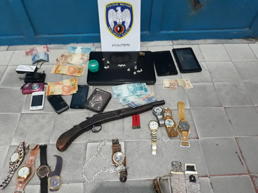 Na casa do acusado, os militares apreenderam crack e maconha, dinheiro, uma espingarda, munições, um televisor de 42 polegadas, dois tabletes, duas câmeras fotográficas, nove relógios, joias, uma nota falsa de 50 reais, e outros materiais.