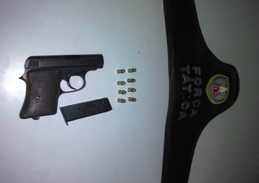 Após realizar buscas no imóvel situado na Rua das Seringueiras, os militares encontraram uma pistola calibre 6.35 com oito munições. O morador foi conduzido ao departamento policial juntamente com a arma apreendida.