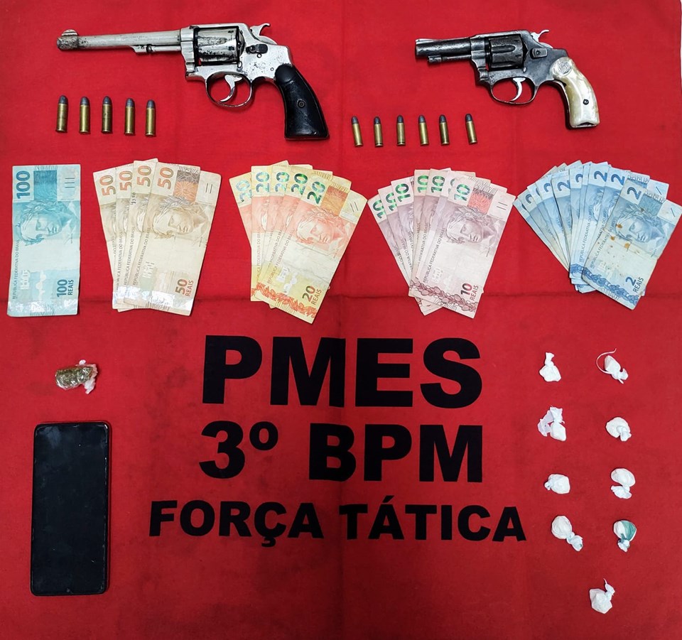 Na noite desta terça-feira (11), os policiais militares da Força Tática do 3º Batalhão apreenderam duas armas de fogo, munições, drogas e dinheiro, em Guaçuí. Um homem foi detido na ação.