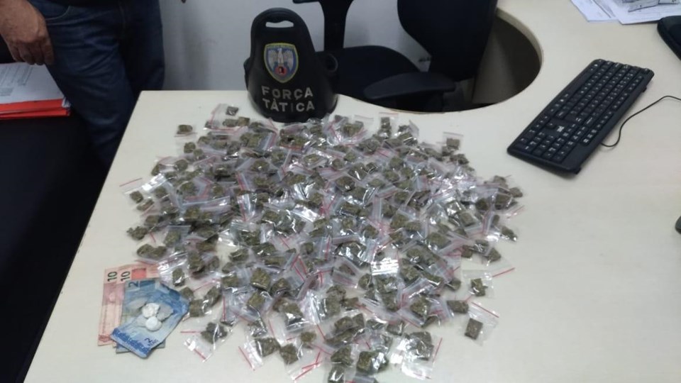 Com isso, a equipe prosseguiu ao referido imóvel, onde funcionava uma oficina, sendo recebida pelos proprietários do estabelecimento, que foram imediatamente informados sobre a denúncia existente. Os policiais passaram a realizar buscas no local e tiveram êxito em localizar uma expressiva quantidade de material para embalar cocaína, 417 buchas de maconha, um aparelho celular, R$ 24,00 e duas capas de colete.