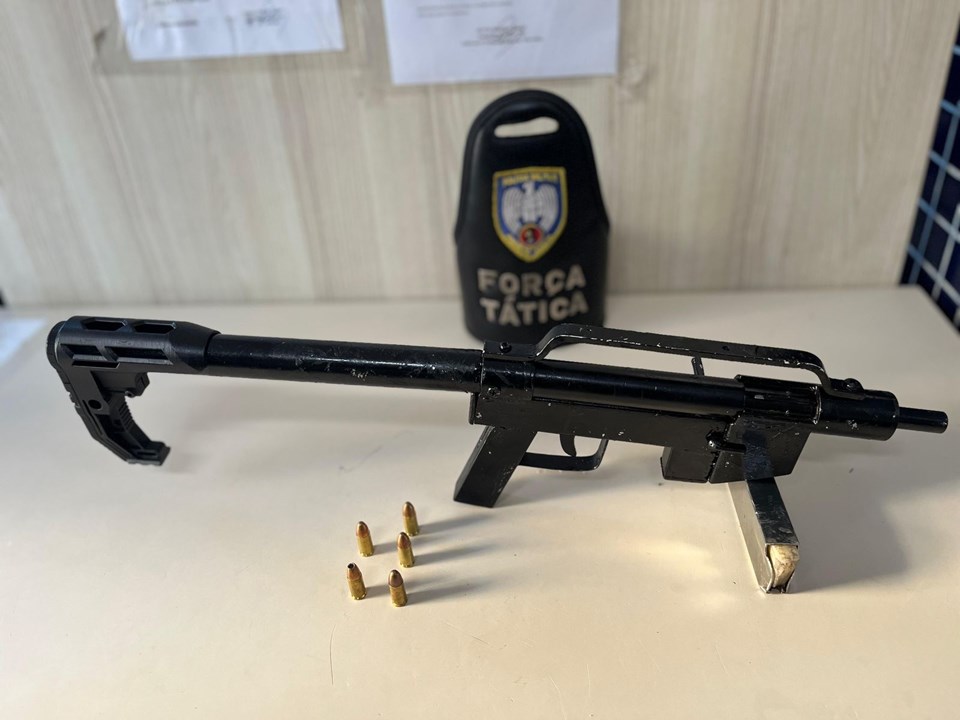 Os policiais estavam em patrulhamento quando se depararam com um indivíduo suspeito. Ele, ao notar a aproximação dos militares, empreendeu fuga, atravessando um valão, não sendo possível abordá-lo. Diante da informação de que o local é comumente utilizado para prática de tráfico de drogas, foi realizada buscas sendo encontrado escondido dentro de um sofá jogado em meio ao mato, uma submetralhadora semi-industrial calibre 9mm, municiada.