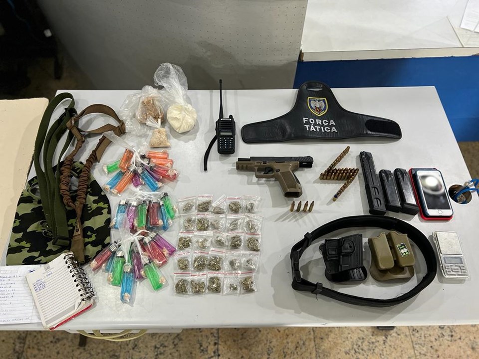 Em outro momento, também no Bairro da Penha, a Força Tática realizou uma nova ação, culminando na apreensão de outro indivíduo envolvido com atividades ilícitas. Os policiais encontraram em sua posse uma pistola calibre 9MM, juntamente com três carregadores para a mesma arma e 47 munições calibre 9mm intactas. Além disso, foram localizadas quatro munições calibre 5.56, considerável quantidade de diversas drogas, uma balança de precisão, um cinto NA, um coldre, um porta carregador duplo, um rádio comunicador baofeng, uma balaclava, duas bandoleiras e uma caderneta com anotações do tráfico.