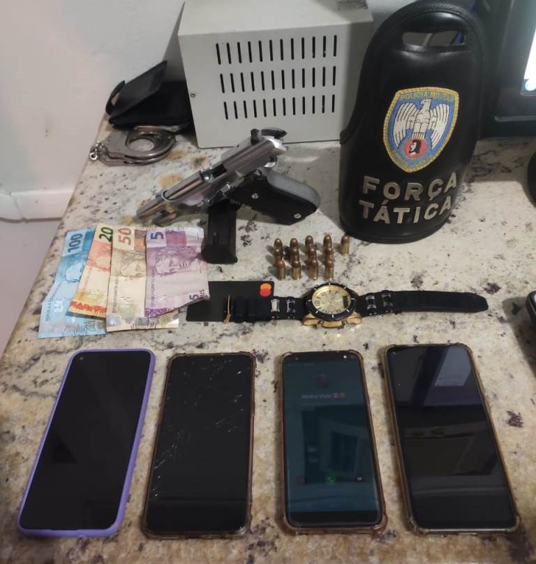 Os militares se aproximaram dos suspeitos e observaram uma mulher com uma arma nas mãos. Os suspeitos tentaram fugir da abordagem policial, mas foram alcançados.