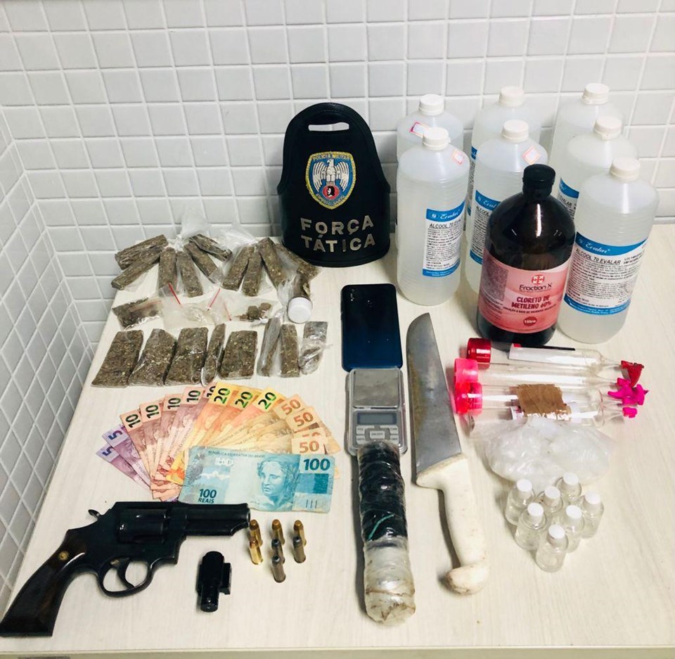Após diligências, com a colaboração do homem detido, foi apreendido mais 16 pedaços de maconha, uma munição calibre 38 intacta, uma pedra de crack, um artefato explosivo improvisado, sete vidros de álcool 70%, um litro de cloreto de metileno, uma mira laser para pistola, uma faca, uma balança de precisão, um aparelho de celular e materiais para embalo de loló e lança perfume.