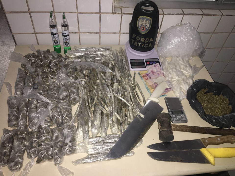 Os militares tomaram conhecimento através do Disque Denúncia de que em determinada localidade suspeitos estariam traficando entorpecentes. De posse das informações, as viaturas da Força Tática juntamente com o serviço de inteligência da Unidade prosseguiram ao local e detiveram dois suspeitos e com eles apreender 1062 buchas de maconha, 110 pinos de cocaína, dois frascos de lança perfume e material para corte e embalo das substâncias entorpecentes.