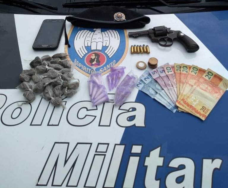 Nesta segunda-feira (09), policiais militares do 6º Batalhão apreenderam drogas e arma em uma ação no município de Serra. O suspeito detido também tinha um mandado de prisão em aberto.