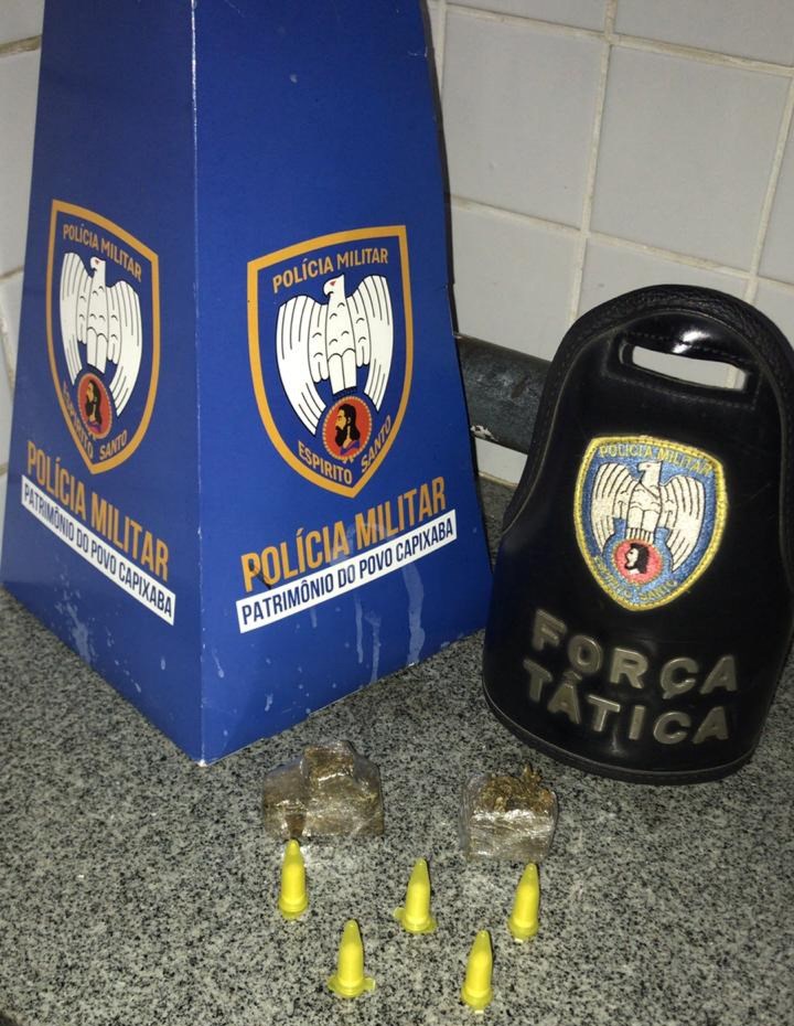 No local, o indivíduo foi abordado pelos militares e com ele foram encontradas 02 buchas de maconha e 05 pinos de cocaína.