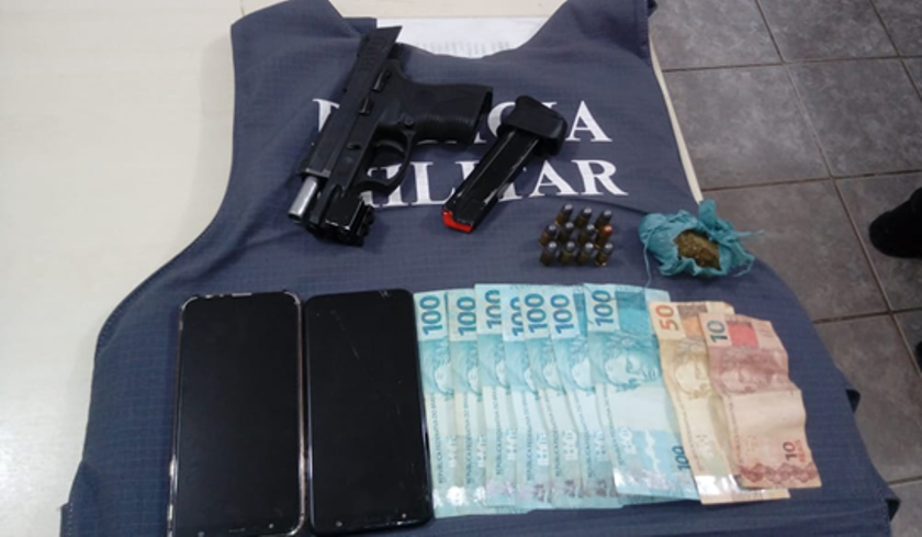 Com eles foi encontrada uma pistola calibre 380 Taurus com mira laser acoplada, 11 munições, dois aparelhos celulares, além de uma porção grande de maconha e R$760,00 em espécie.