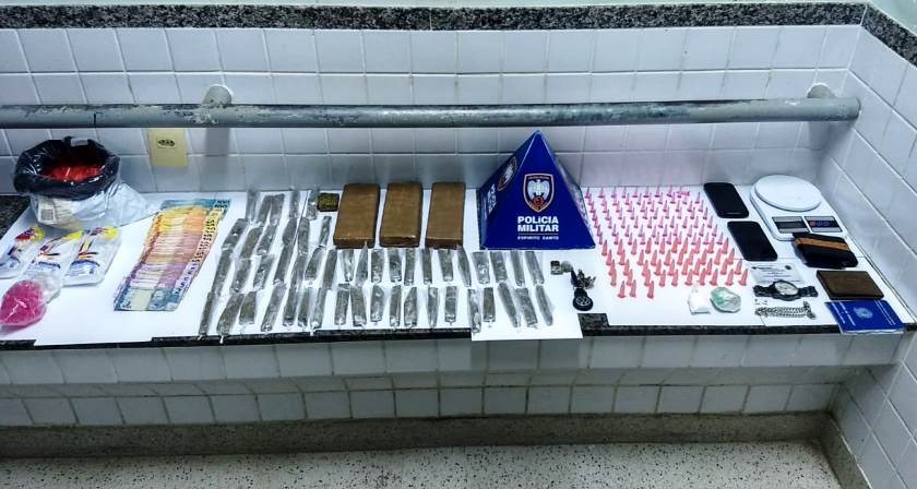 No local informado e no interior da residência os militares apreenderam quatro tabletes e 49 buchas de maconha, 113 pinos de cocaína e uma pedra de cocaína.