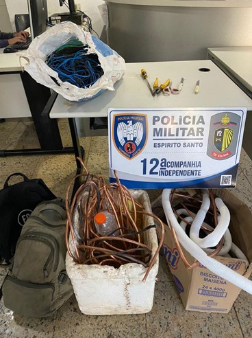 Por volta das 15h, uma denúncia ao plantão da 12ª Cia Ind deu conta de que dois homens haviam roubado grande quantidade de fios de cobre e estavam em avenida do bairro Jardim Camburi. A equipe foi ao local e constatou que os indivíduos estavam em posse dos fios de cobre e não informaram a procedência. Com eles foram encontrados 01 alicate, 01 tesoura, 02 facas e 01 chave de fenda.