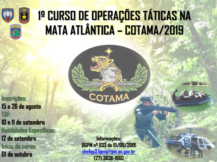 Estão abertas as inscrições para o Curso de Operações Táticas na Mata Atlântica (Cotama/2019), promovido pelo Batalhão de Polícia Militar Ambiental (BPMA).
