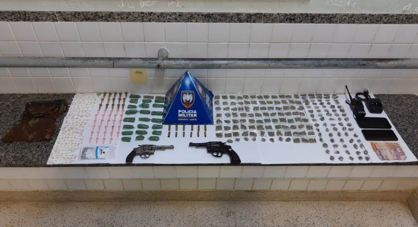 No último sábado (03), policiais militares do 10º Batalhão detiveram dois menores e apreenderam duas armas de fogo, além de munições e entorpecentes. A ação ocorreu no bairro Camurugi, em Guarapari.