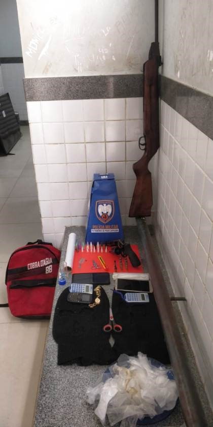Na ação policial foram apreendidos um revólver calibre 38, uma espingarda de ar comprimido, pinos de cocaína, celulares, munições e outros materiais ilícitos.