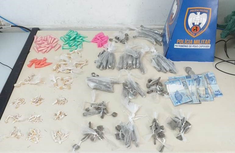 Os policiais receberam a informação de que suspeitos estariam embalando entorpecentes em uma região de mata, próxima ao ponto final do bairro. Prontamente os militares foram ao local, e mesmo sem encontrar nenhum suspeito, iniciaram buscas pelo terreno. Os policiais localizaram uma sacola contendo 152 pedras de crack,130 buchas de maconha e 69 pinos de cocaína, além de R$ 40,50 em espécie.