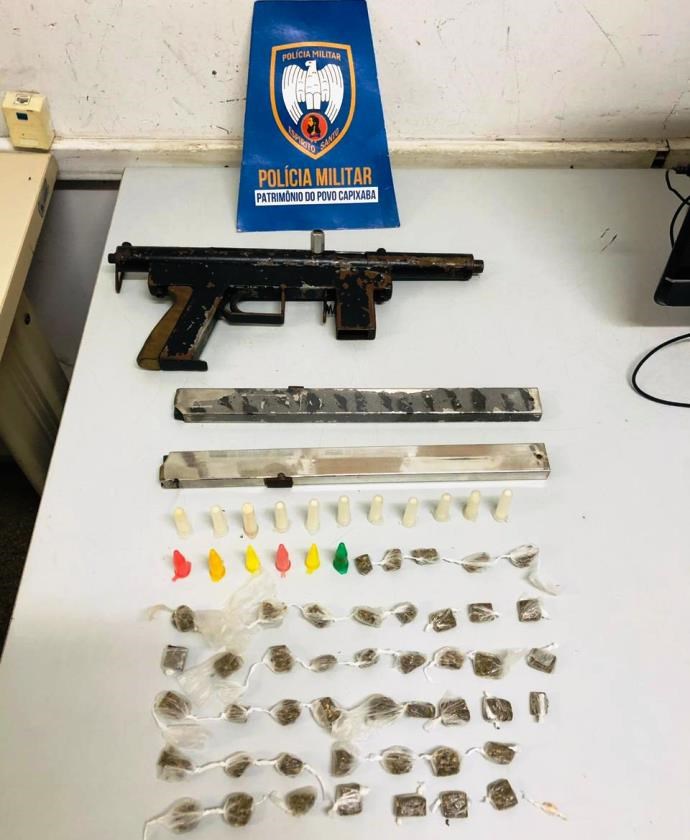 Após denúncias anônimas de que suspeitos estariam em posse de arma de fogo no bairro Carapina Grande, militares prosseguiram ao local, porém, não encontraram nenhum suspeito. Buscas foram realizadas em uma área onde os suspeitos estariam, sendo encontrada uma sacola com uma metralhadora, dois carregadores, 45 buchas de maconha, 17 pinos de cocaína e uma pedra de crack.