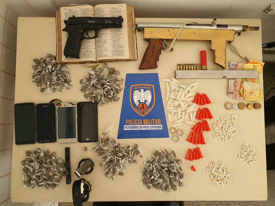 Já na madrugada, militares patrulhavam o bairro Planalto Serrano quando visualizaram o momento em que um suspeito, portando uma arma de fogo, adentrou um quintal. Feita a abordagem, foi apreendida uma pistola calibre .40 com dois carregadores e 25 munições. Nas buscas foram encontrados 3.460 pedras de crack, 581 buchas de maconha, dois tabletes de maconha, um tablete de crack, dois comprimidos de êxtase, R$ 3.505,00 em espécie, além de diversos materiais usados para preparo e venda de entorpecentes.