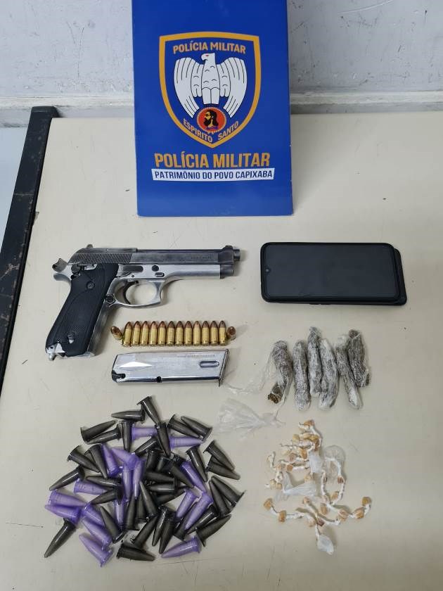Durante patrulhamento no bairro Vista da Serra, militares visualizaram e abordaram um veículo com três suspeitos a bordo. Realizada a revista e busca pessoal foi encontrada uma pistola calibre 9mm com 14 munições, além de uma sacola contendo 55 pinos de cocaína, 38 pedras de crack e seis buchas de maconha.