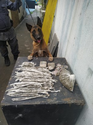 No bairro Jardim Limoeiro, militares da Equipe de Patrulhamento K9 prosseguiram até um terreno baldio, onde aplicaram o cão farejador Apollo. No local foram localizadas 161 buchas, um tablete e uma sacola de maconha.