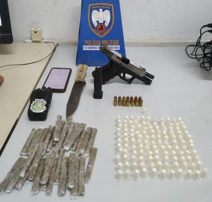 Em outra ação, militares receberam a denúncia de que um suspeito portava uma arma de fogo, no bairro Taquara I. Diante disso, as equipes prosseguiram ao local e localizaram o suspeito. Com ele apreenderam uma pistola calibre 380 com 14 munições, além de 122 pinos de cocaína e 32 palitos de maconha.