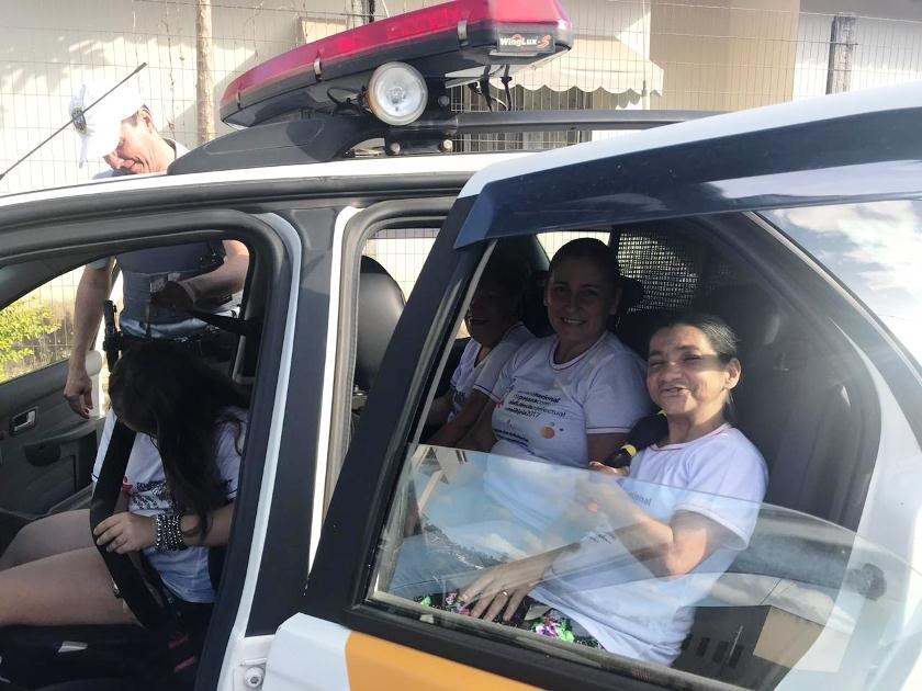 Após a apresentação, os alunos tiveram a oportunidade de passear em uma viatura, além de receber informações sobre o serviço do policial militar.